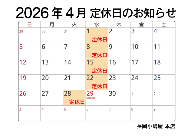 3月2日(月)~5日(木)の4日間、店舗設備工事のため臨時休業させていただきます。ご不便をおかけし申し訳ございません。