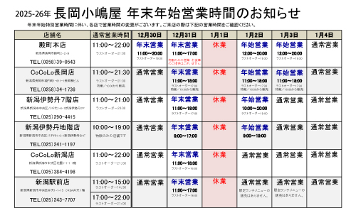 年末年始は、各店で営業時間の変更がございます。下記の画像をクリックしていただくと、解像度の高いPDFをご覧いただけますので、ご来店の折は営業時間をご確認くださいませ。